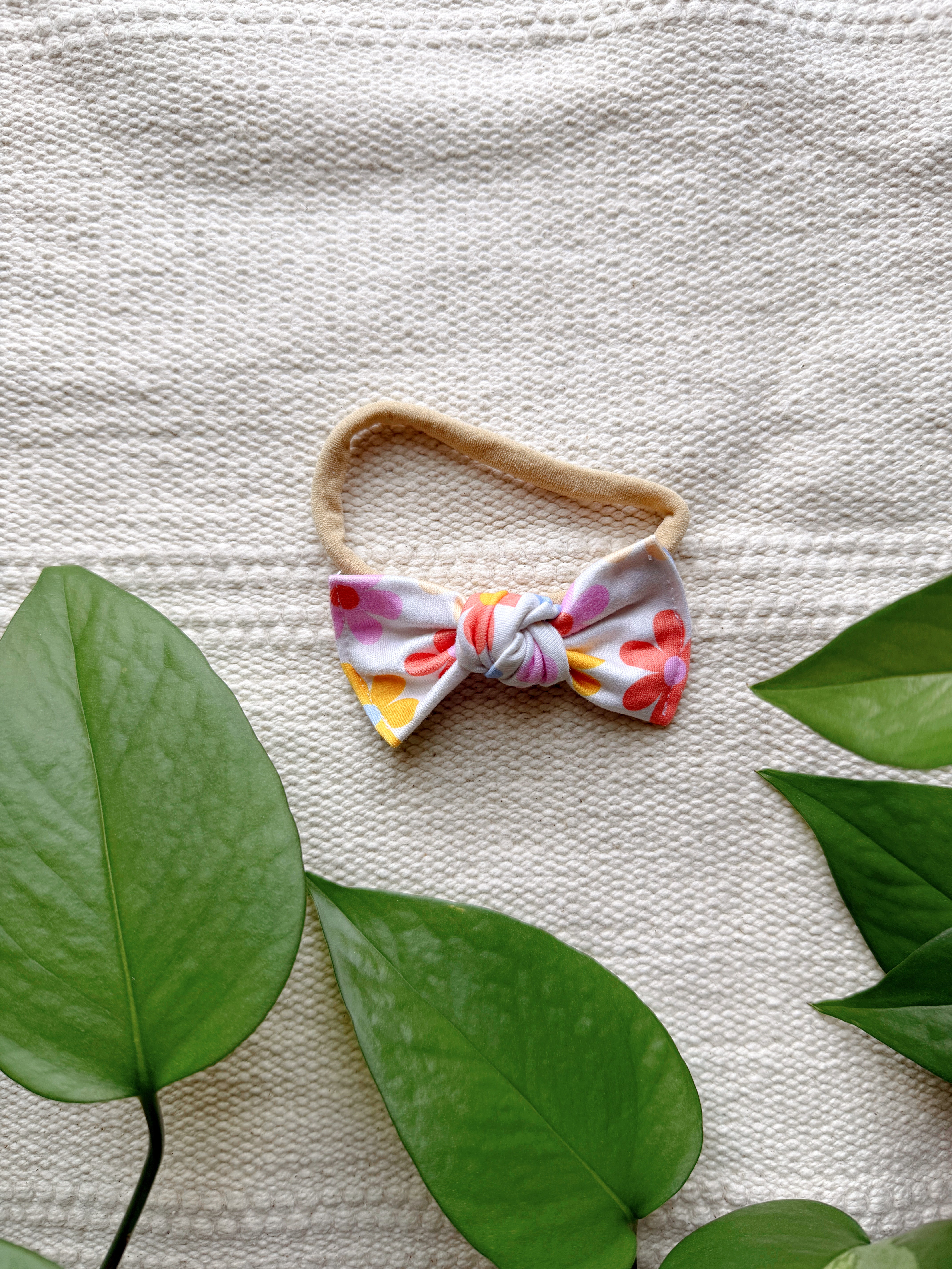 This thin stretchy nylon band will fit newborn - 12mo comfortably. Features a 3” sewn, hand tied bow.